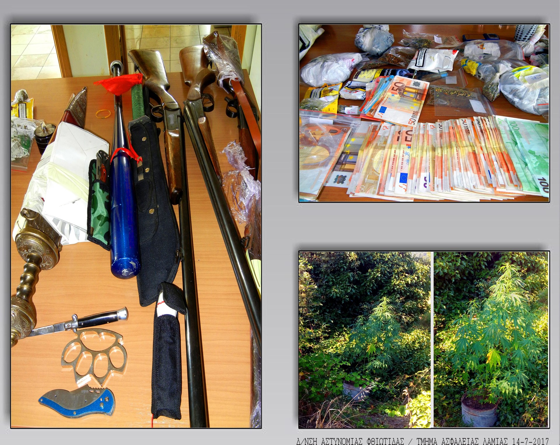Από τις έρευνες, βρέθηκαν και κατασχέθηκαν πέντε δενδρύλλια κάνναβης, πλήρη ανάπτυξης μετά ριζικού συστήματος, 396,05 γραμμάρια ακατέργαστης κάνναβης, μαχαίρια – στιλέτα, ξίφη, ένα νόμισμα και ένα μπρούτζινο αγαλματίδιο ύψους 10 εκατοστών.