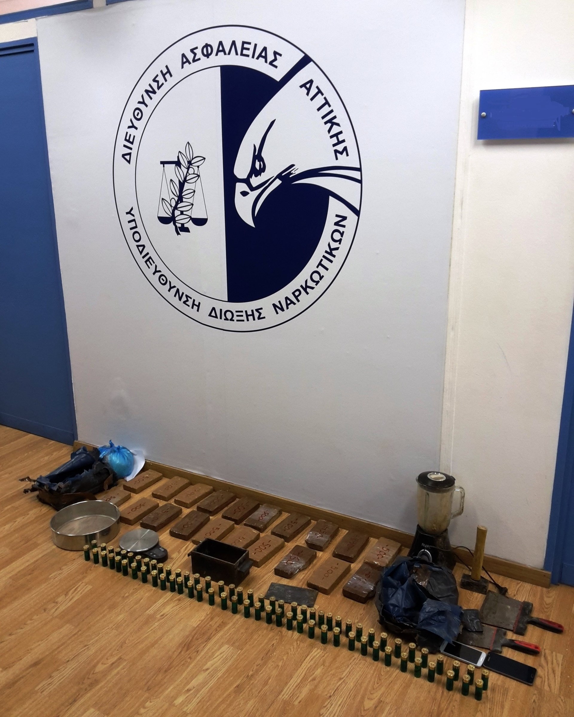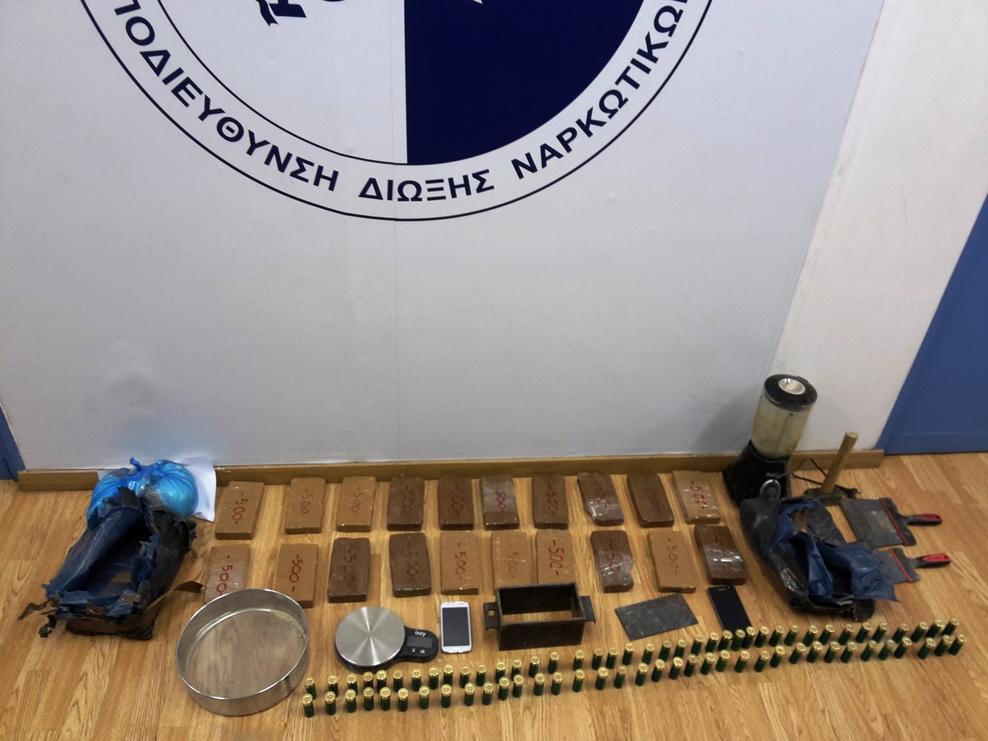 Από την έρευνα σε οικίες και χώρους βρέθηκαν και κατασχέθηκαν ποσότητα ηρωίνης βάρους 9 κιλών και 890 γραμμαρίων, νοθευτική ουσία βάρους δύο κιλών, μία ζυγαριά, διάφορα εξαρτήματα νόθευσης (μίξερ, πλάκα, καλούπι κλπ), δύο κινητά τηλέφωνα και 75 κυνηγετικά φυσίγγια.