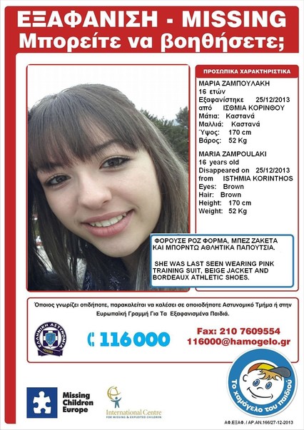 Στις 25/12/2013, στις 22:30 εξαφανίστηκε από την περιοχή Ίσθμια Κορίνθου, η Μαρία Ζαμπουλάκη, 16 ετών. Να σημειωθεί ότι η μόνιμη κατοικία της οικογένειας είναι στο Ζεφύρι Αττικής.