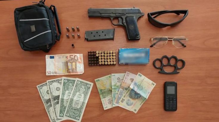 Επιπλέον, από τη σωματική έρευνα βρέθηκαν και κατασχέθηκαν γεμιστήρα με -6-φυσίγγια, τσαντάκι που περιείχε κουτί με 32 φυσίγγια, σιδερογροθιά, κινητό τηλέφωνο, καθώς και -50- ευρώ, -4- δολάρια Η.Π.Α. και -62- LEI Ρουμανίας.