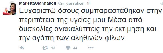 “Ευχαριστώ όσους συμπαραστάθηκαν στην περιπέτεια της υγείας μου.Μέσα από δυσκολίες ανακαλύπτεις την εκτίμηση και την αγάπη των αληθινών φίλων” έγραψε η κ. Γιαννάκου στο Twitter.