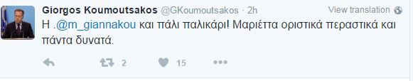 “Η Μαριέττα Γιαννάκου και πάλι παλικάρι! Μαριέττα οριστικά περαστικά και πάντα δυνατά” έγραψε στο Twitter o εκπρόσωπος Τύπου της ΝΔ Γιώργος Κουμουτσάκος.
