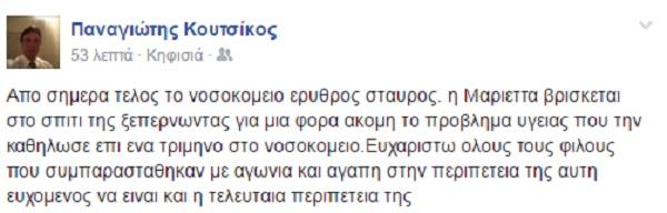 «Από σήμερα τέλος το νοσοκομείο Ερυθρός Σταυρός. Η Μαριέττα βρίσκεται στο σπίτι της ξεπερνώντας για μια φορά ακόμη το πρόβλημα υγείας που την καθήλωσε επί ένα τρίμηνο στο νοσοκομείο. Ευχαριστώ όλους τους φίλους που συμπαραστάθηκαν με αγωνία και αγάπη στην περιπέτεια της αυτή ευχόμενος να είναι και η τελευταία περιπέτεια της» έγραψε στο Facebook ο πρώην σύζυγος της Παναγιώτης Κουτσίκος:
