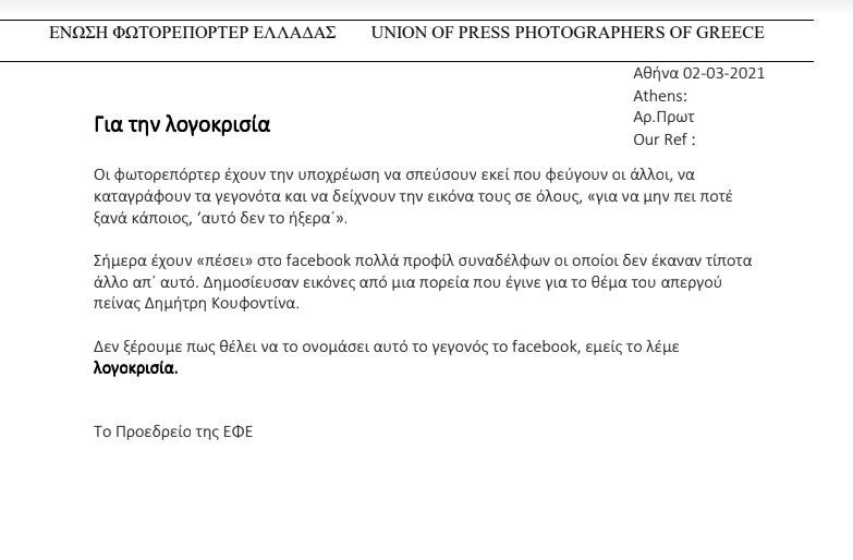 Η Ένωση Φωτορεπόρτερ Ελλάδας εξέδωσε ανακοίνωση για το συγκεκριμένο περιστατικό στην οποία κατηγορούν το Facebook για λογοκρισία.
