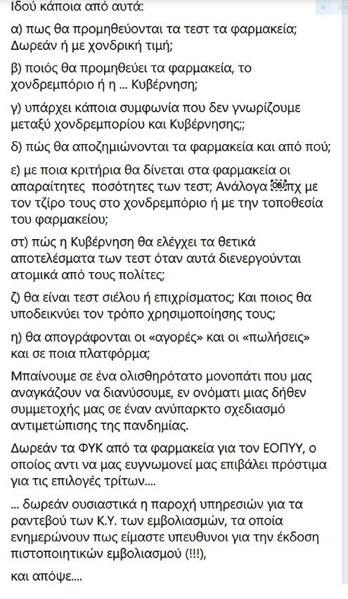 «Υπάρχουν όμως και επί πλέον κρίσιμα ερωτήματα: Τα αποτελέσματα των τεστ που θα γίνονται στο σπίτι πως θα ελέγχονται; Πως θα κοινοποιούνται στην πολιτεία ώστε να γνωρίζει ανά πάσα στιγμή την εικόνα της πανδημίας; Δεν υπάρχει καμία πρόβλεψη δυστυχώς. Οι φαρμακοποιοί της Αττικής Είναι εξαιρετικά επιφυλακτικοί σε τέτοιου είδους επικοινωνιακού τύπου εξαγγελίες», καταλήγει ο Φαρμακευτικός Σύλλογος Αττικής.