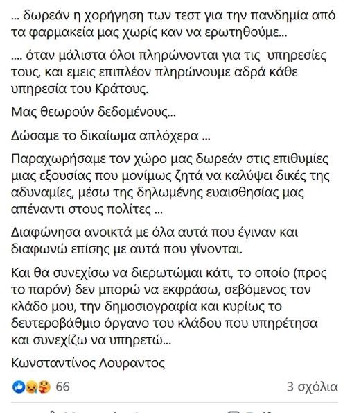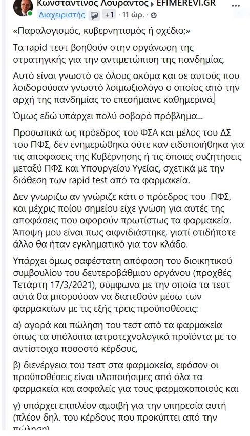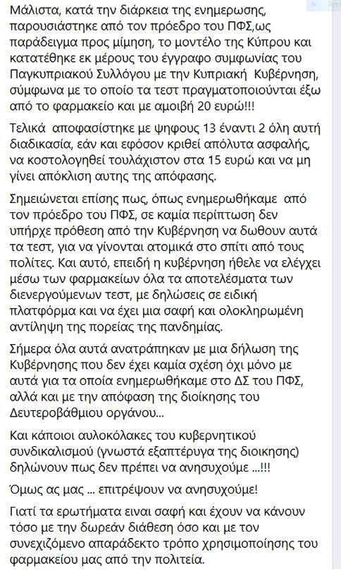 «Το διοικητικό συμβούλιο του ΠΦΣ προσφάτως εξέτασε τη δυνατότητα διάθεσης και διενέργειας των rapid test ανίχνευσης αντιγόνου COVID-19 μέσα από τα φαρμακεία μας κατά τα πρότυπα άλλων χωρών που έχουν ήδη εφαρμόσει τη διαδικασία όπως Γαλλία, Ισπανία, Πορτογαλία, Βέλγιο, Τσεχία, Αυστρία και τελευταία και η Κύπρος και αποφάσισε να καταθέσει ολοκληρωμένη πρόταση στον υπουργό Υγείας. Οι χθεσινές δηλώσεις της κυβέρνησης αφορούν τη δωρεάν διάθεση, μέσω των φαρμακείων, rapid test που θα γίνονται από τους ίδιους τους πολίτες. Η επιλογή από την κυβέρνηση, βάσει της τρέχουσας συγκυρίας, της δυνατότητας μαζικής διάθεσης test ανίχνευσης αντιγόνου COVID-19 για τον πληθυσμό μέσω των φαρμακείων, θα συζητηθεί στο διοικητικό συμβούλιο του ΠΦΣ, αφού προηγηθεί συνάντηση με την πολιτική ηγεσία του υπουργείου Υγείας για να εξετασθούν και να επιλυθούν τα ζητήματα που προκύπτουν από τον τρόπο και τη διαδικασία διάθεσής τους».