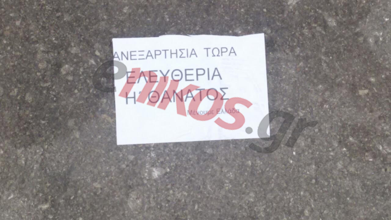 Πριν από λίγο, ομάδα ατόμων πέταξε φέιγ βολάν κάποια από τα οποία γράφουν: “Γερμανοτσολιάδες, Δοσίλογοι, Προδότες, – Σύντομα θα λογαριαστούμε”.