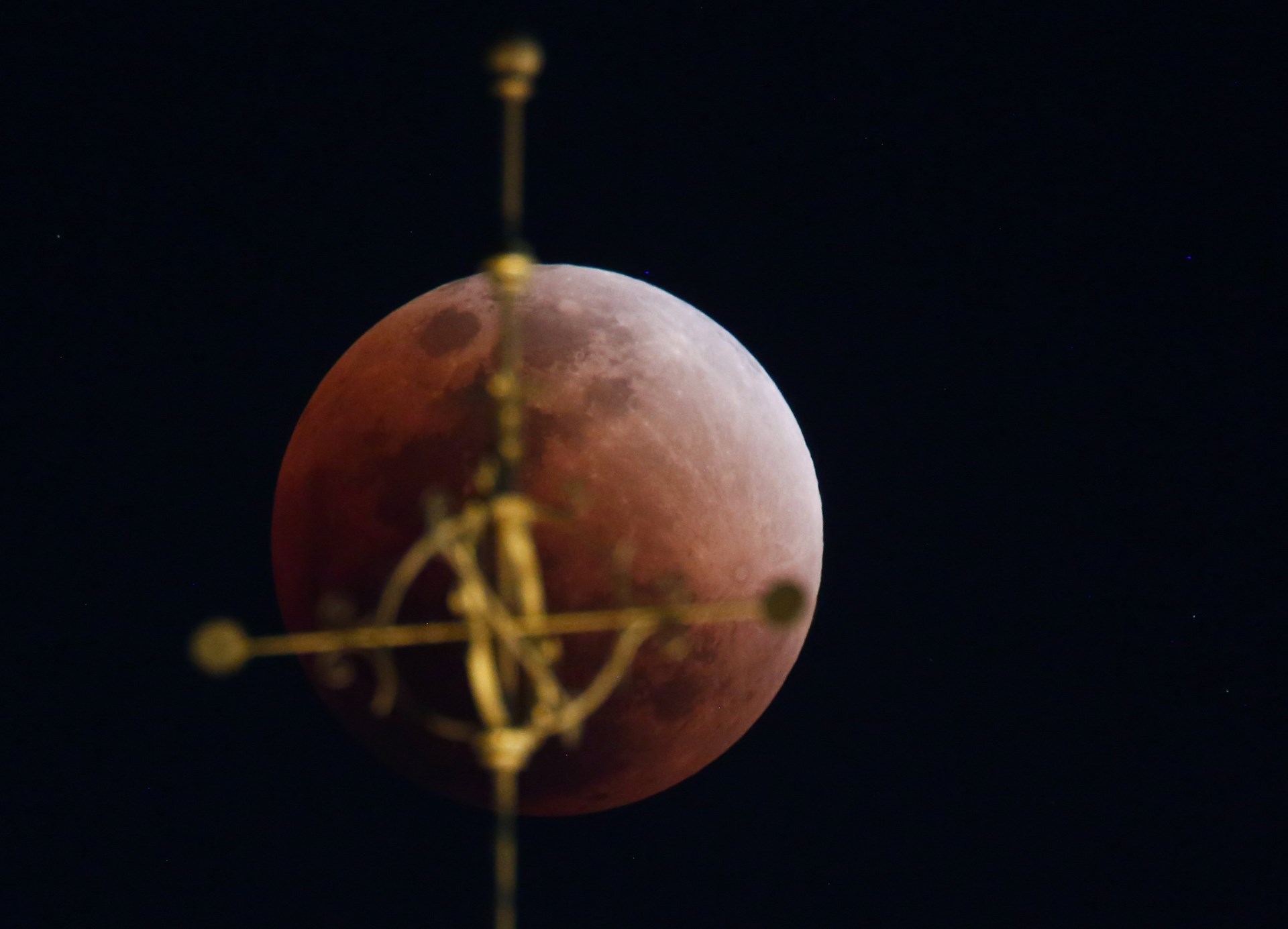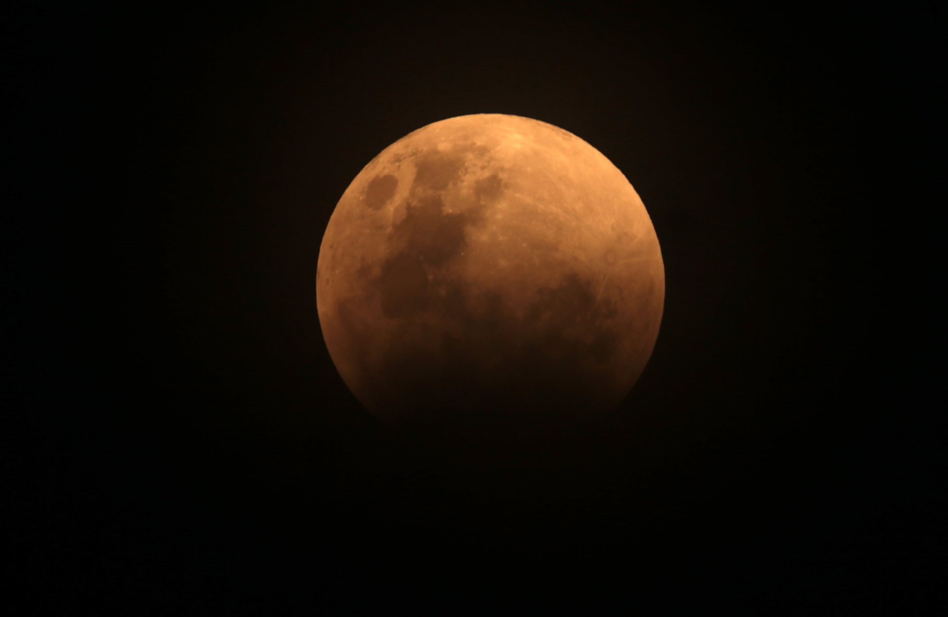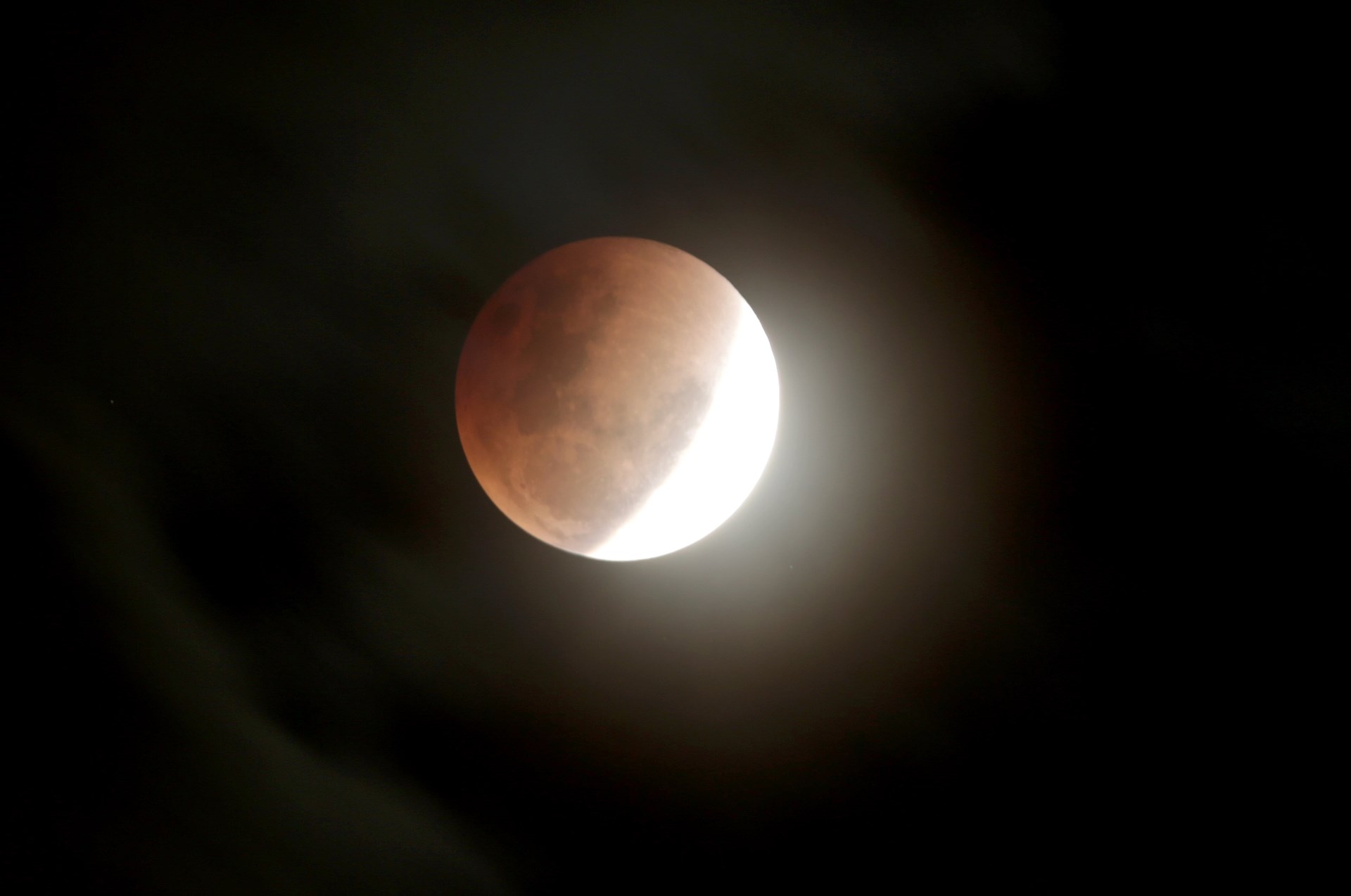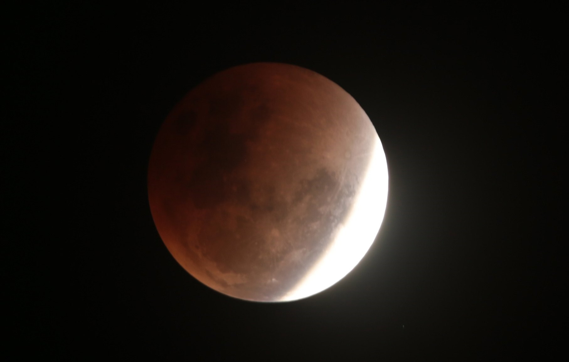 Η έκλειψη ξεκίνησε περίπου 15 λεπτά αργότερα, καθώς μια μαύρη σκιά άρχισε να καλύπτει τη λευκή υπέρ-Σελήνη. Μια ώρα μετά, το φεγγάρι χάθηκε τελείως κι όταν επανεμφανίστηκε η επιφάνειά του είχε πάρει το χρώμα του χαλκού. “Το κόκκινο χρώμα κατά τη διάρκεια μιας σεληνιακής έκλειψης είναι πολύ ιδιαίτερο, είναι ένα σπάνιο δώρο να μπορέσουμε να παρακολουθήσουμε ένα ματωμένο φεγγάρι”, σχολίασε ο καθηγητής φυσικής Μπράιαν Ράτσφορντ. Η κόκκινη ή χάλκινη απόχρωση είναι ένα φυσικό φαινόμενο που οφείλεται στο φιλτράρισμα του ηλιακού φωτός από τη γήινη ατμόσφαιρα.
