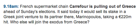 Ο Guardian αναφέρει πως “η γαλλική αλυσίδα των σούπερ μάρκετ φεύγει από την χώρα μας λίγο πριν τις εκλογές. Παρά το γεγονός ότι θα χάσει συνολικά 220 εκατομμύρια ευρώ, το Carrefour θα πουλήσει το μερίδιό του στον συνέταιρό του Μαρινόπουλο” αναφέρεται στο δημοσίευμα.