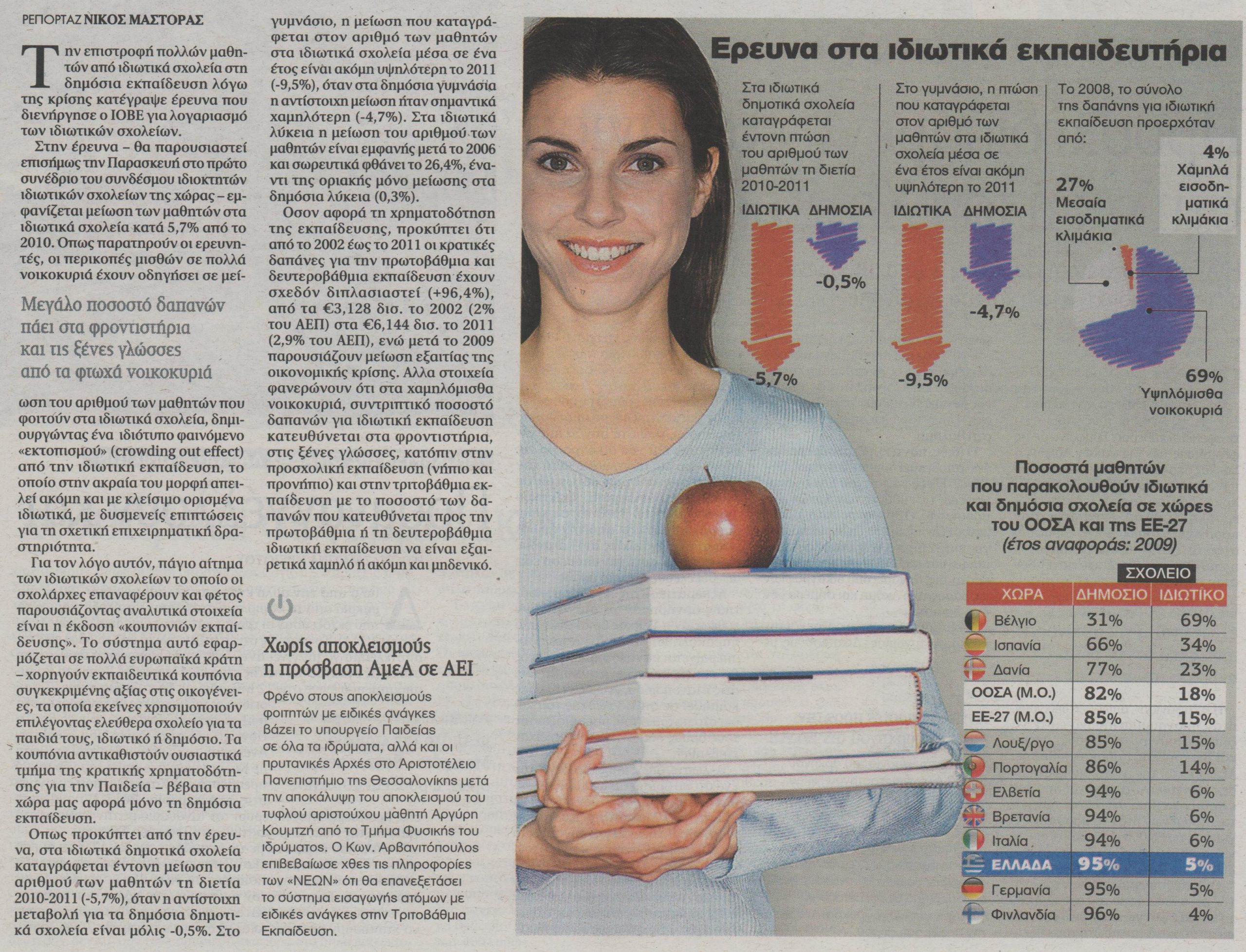 Στην έρευνα –θα παρουσιαστεί επισήμως την Παρασκευή στο πρώτο συνέδριο του συνδέσμου ιδιοκτητών ιδιωτικών σχολείων της χώρας- εμφανίζεται μείωση των μαθητών στα ιδιωτικά σχολεία κατά 5,7% από το 2010.