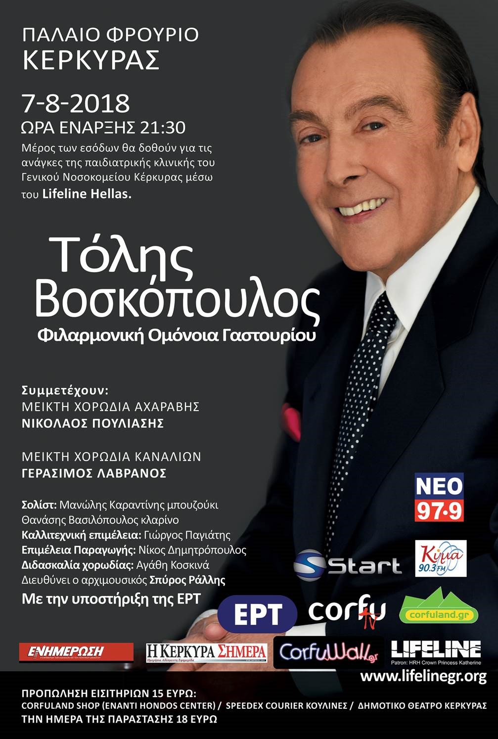 Ο διεθνής ανθρωπιστικός οργανισμός Lifeline Hellas που τελεί υπό την πατρωνία της ΑΒΥ Πριγκίπισσας Αικατερίνης της Σερβίας, γραφεία του οποίου υπάρχουν σε Αθήνα, Νέα Υόρκη, Σικάγο, Τορόντο και Λονδίνο, στο πλαίσιο των ανθρωπιστικών του δραστηριοτήτων πρόκειται να πραγματοποιήσει μουσική εκδήλωση στο Παλαιό Φρούριο Κέρκυρας την Τρίτη στις 7 Αύγουστου 2018 στις 21:30, στην οποία θα πάρουν μέρος ο καλλιτέχνης Τόλης Βοσκόπουλος με τη φιλαρμονική Γαστουρίου και τις χορωδίες Αχαράβης και Καναλίων.