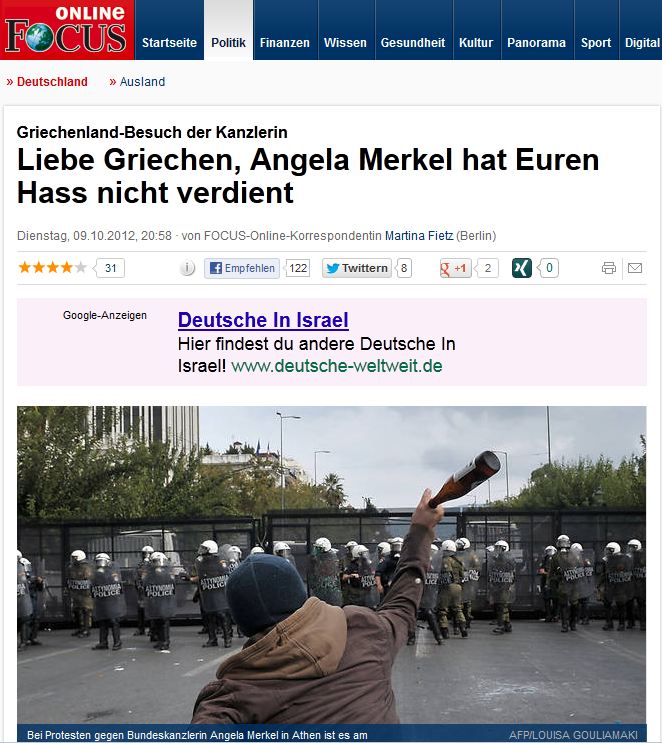 Μια επιστολή με αποδέκτη τον ελληνικό λαό δημοσιεύει σήμερα το ευρείας κυκλοφορίας γερμανικό περιοδικό Focus με τον τίτλο: «Αγαπητοί Έλληνες, η Angela Merkel δεν αξίζει το μίσος σας». Διαβάστε την επιστολή: “Οι έντονες αντιδράσεις στην επίσκεψη της Καγκελαρίου στην Αθήνα είναι λανθασμένη αντίδραση. Οι Έλληνες πρέπει να επαναδιοργανώσουν το κράτος τους – ταχύτατα μάλιστα.Αγαπητοί Έλληνες, πολλοί από εμάς τους Γερμανούς αγαπούν την χώρα σας, τα αρχαία μνημεία, τα νησιά, την θάλασσα, το κλίμα, τη κουζίνα σας και το κρασί σας. Ταξιδεύουμε συχνά και με μεγάλη χαρά στη χώρα σας, ένας λόγος είναι ότι είσαστε τόσο διαφορετικοί από εμάς, πιο άνετοι και με πιο μεγάλη χαρά ζωής. Ως τώρα υπήρχε η εντύπωση ότι και ομογενείς σας που μένουν στη Γερμανία αισθάνονται καλά. Δεν εμφανίζονται ως ξένοι αλλά ως μέρος της κοινωνίας στην οποία προσμετρούνται εδώ και χρόνια οι νότιοι Ευρωπαίοι. Όλα αυτά δε θα έπρεπε να τα ξεχάσετε καθώς το τελευταίο καιρό ακούγονται από εσάς υβριστικά σχόλια για την Γερμανία. Με τον ίδιο τρόπο οφείλουν οι Γερμανοί να αντιληφθούν ότι και για εμάς τους Γερμανούς η Ευρώπη σημαίνει πολλά παραπάνω από ένα σταθερό Ευρώ. Μέσα στη κρίση δε πρέπει να χαθούν αυτά που μας ενώνουν. Για αυτό απαιτείται και οι δυο πλευρές να διατηρούν μια ρεαλιστική ματιά στα δρώμενα. Ακόμη και αν πρόκειται για μερικές δεκάδες χιλιάδες που διαδηλώνουν στην Αθήνα και εκφωνούν προσβλητικά συνθήματα: είσαστε ένα έθνος έντεκα εκατομμυρίων. Δε μπορώ να φανταστώ, ότι στη πλειοψηφία σας πιστεύετε ότι για την τωρινή κατάντια της χώρας σας ευθύνεται η γερμανίδα ομοσπονδιακή Καγκελάριος. Δεν έχει κανένα νόημα να ξεσπάτε στην πρόεδρο κυβέρνησης της χώρας η οποία σαν καμιά άλλη μπορεί (και πρέπει) να φέρει προσπάθειες για βοήθεια στην Ελλάδα και μ’ αυτό να συγκρατήσει την Ενωμένη Ευρώπη.