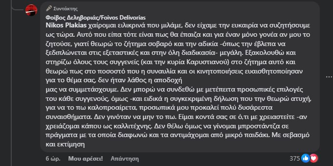 Ο Φοίβος Δεληβοριάς, απευθυνόμενος προσωπικά στον Νίκο Πλακιά, ανέφερε: «Νίκο Πλακιά, χαίρομαι ειλικρινά που μιλάμε, δεν είχαμε την ευκαιρία να συζητήσουμε ως τώρα. Αυτό που είπα τότε είναι πως θα έπαιζα και για έναν μόνο γονέα αν μου το ζητούσε, γιατί θεωρώ το ζήτημα σοβαρό και την αδικία – όπως την έβλεπα να ξεδιπλώνεται στις εξεταστικές και στην όλη διαδικασία – μεγάλη. Εξακολουθώ και στηρίζω όλους τους συγγενείς (και την κυρία Καρυστιανού) στο ζήτημα αυτό και θεωρώ πως, στο ποσοστό που η συναυλία και οι κινητοποιήσεις ευαισθητοποίησαν για το θέμα σας, δεν ήταν λάθος η αποδοχή μας να συμμετάσχουμε. Δεν μπορώ να συνδεθώ με μετέπειτα προσωπικές επιλογές του κάθε συγγενούς, όμως – και ειδικά η συγκεκριμένη δήλωση, που τη θεωρώ ατυχή, για να το πω καλοπροαίρετα – προσωπικά μου προκαλεί πολύ δυσάρεστα συναισθήματα. Δεν γινόταν να μην το πω. Είμαι κοντά σας σε ό,τι με χρειαστείτε – αν χρειάζομαι κάπου ως καλλιτέχνης. Δεν θέλω όμως να γίνομαι μπροστάντζα σε πράγματα με τα οποία διαφωνώ και τα αντιμάχομαι από μικρό παιδάκι. Με σεβασμό και εκτίμηση».