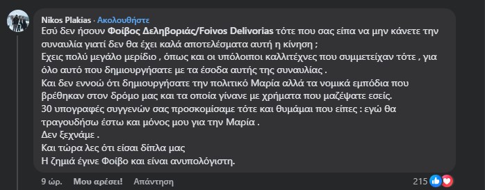 Ο Νίκος Πλακιάς, συγγενής θύματος των Τεμπών, απάντησε κάτω από την ανάρτηση, κατηγορώντας τον τραγουδοποιό για «μεγάλο μερίδιο ευθύνης» σχετικά με τις νομικές δυσκολίες που – όπως υποστήριξε – προέκυψαν από τα έσοδα της συναυλίας που είχε διοργανωθεί για τα θύματα. «Εσύ δεν ήσουν, Φοίβο Δεληβοριά, τότε που σας είπα να μην κάνετε τη συναυλία γιατί δεν θα έχει καλά αποτελέσματα αυτή η κίνηση; Έχεις πολύ μεγάλο μερίδιο, όπως και οι υπόλοιποι καλλιτέχνες που συμμετείχαν τότε, για όλο αυτό που δημιουργήσατε με τα έσοδα αυτής της συναυλίας. Και δεν εννοώ ότι δημιουργήσατε την πολιτικό Μαρία, αλλά τα νομικά εμπόδια που βρέθηκαν στον δρόμο μας και τα οποία έγιναν με χρήματα που μαζέψατε εσείς. 30 υπογραφές συγγενών σας προσκομίσαμε τότε και θυμάμαι που είπες: εγώ θα τραγουδήσω έστω και μόνος μου για τη Μαρία. Δεν ξεχνάμε. Και τώρα λες ότι είσαι δίπλα μας. Η ζημιά έγινε, Φοίβο, και είναι ανυπολόγιστη».