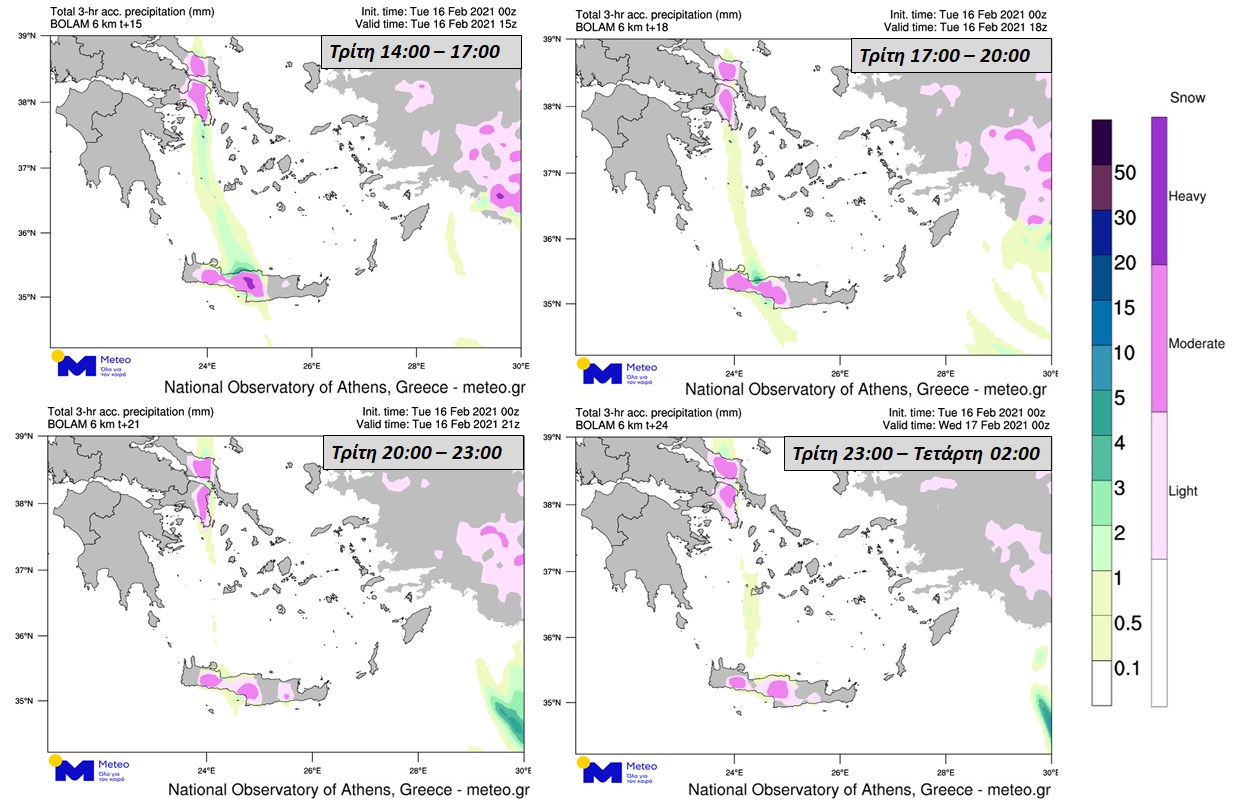 Από το βράδυ της Τρίτης τα φαινόμενα θα περιοριστούν σταδιακά στην Κεντρική Εύβοια, στα βόρεια της Αττικής και στη Δυτική Κρήτη και έως το πρωί της Τετάρτης θα σταματήσουν. Στους προγνωστικούς χάρτες που ακολουθούν παρουσιάζεται ο ολικός υετός (βροχή/χιόνι) που αναμένεται από το απόγευμα της Τρίτης 16/2 έως τις πρώτες ώρες της Τετάρτης 17/2 σύμφωνα με το μοντέλο πρόγνωσης υψηλής ανάλυσης του Εθνικού Αστεροσκοπείου Αθηνών/meteo.gr.