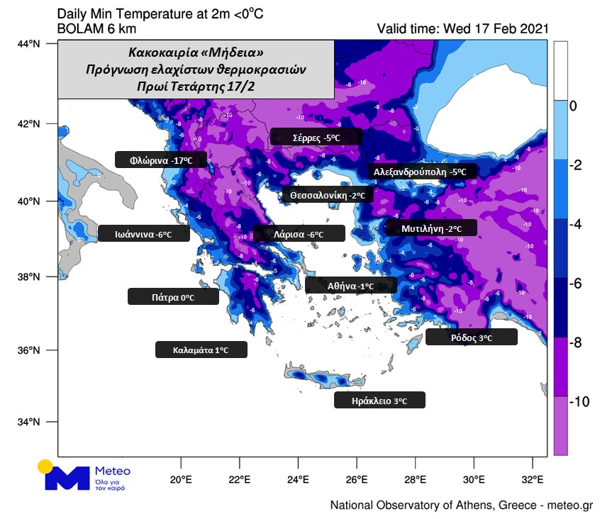 Στον χάρτη που ακολουθεί παρουσιάζονται οι περιοχές όπου η ελάχιστη θερμοκρασία που αναμένεται αύριο το πρωί θα πέσει κάτω από μηδέν βαθμούς Κελσίου καθώς και οι ελάχιστες θερμοκρασίες για επιλεγμένες πόλεις της χώρας. Είναι εντυπωσιακό ότι στο σύνολο σχεδόν της ηπειρωτικής χώρας αλλά και σε σημαντικό μέρος της νησιωτικής θα σημειωθούν αρνητικές θερμοκρασίες.
