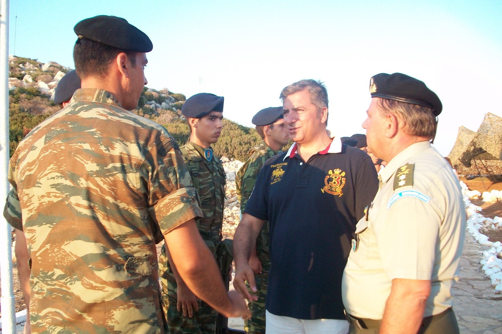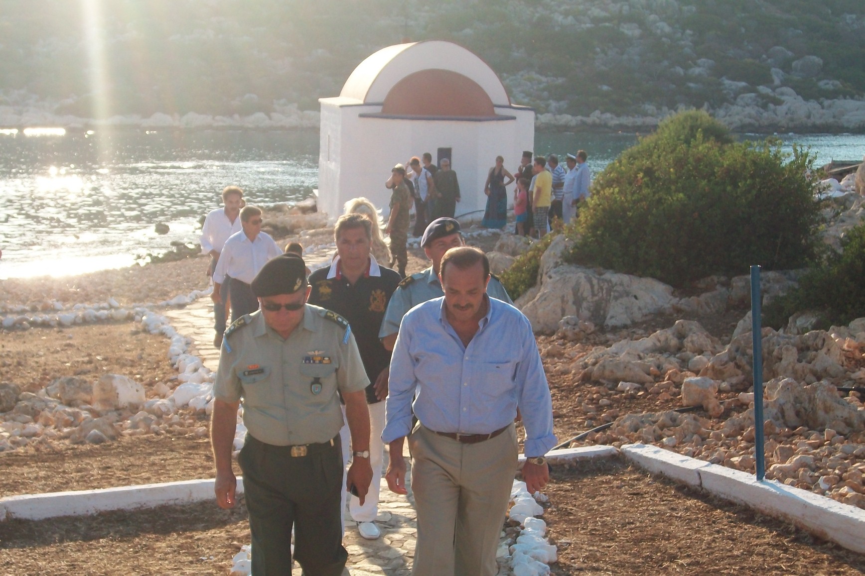 Ο Αντιπεριφερειάρχης Νοτίου Αιγαίου Φ. Χατζηδιάκος, ο Στρατηγός Ν. Δεβετζής, ο Δήμαρχος Αμαρουσίου και Πρόεδρος ΙΣΑ Γ. Πατούλης και οι λοιποί στην αποβίβαση στη Ρω.