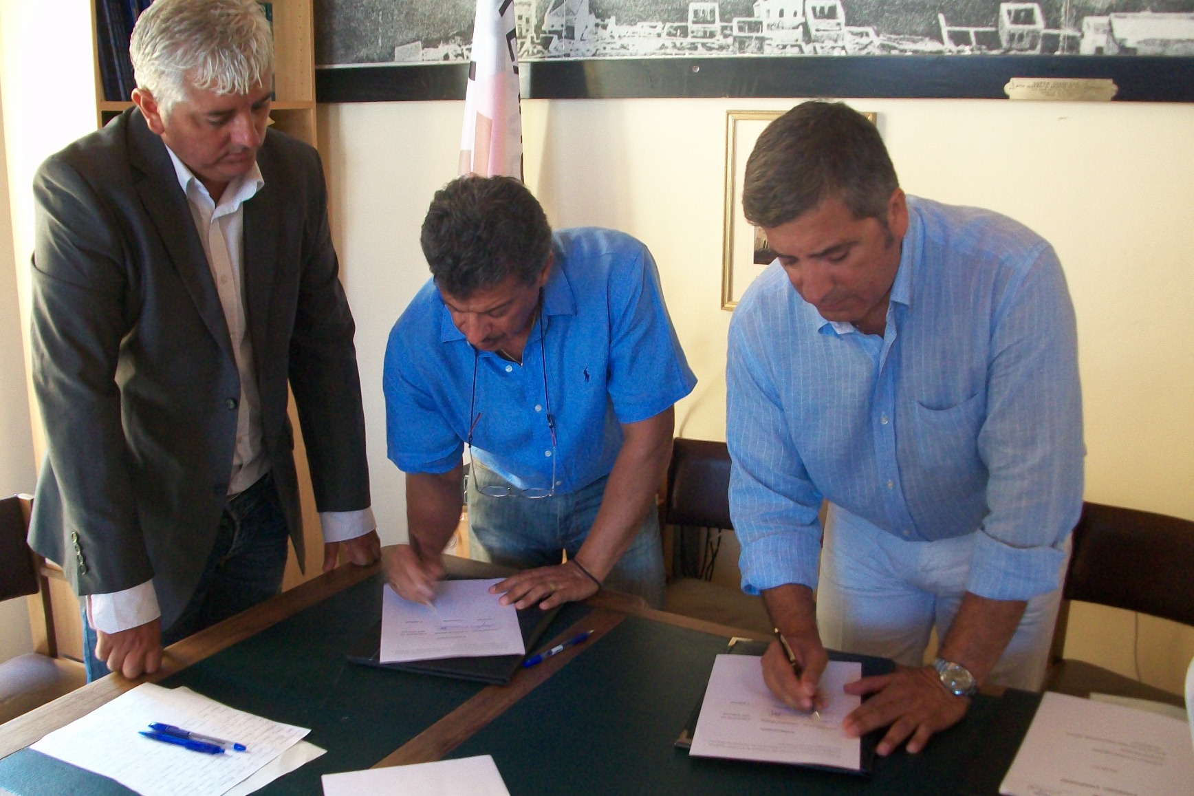 Ο Πρόεδρος του Εθνικού διαδημοτικού Δικτύου Υγείας και του Ιατρικού Συλλόγου Αθηνών, Δήμαρχος Αμαρουσίου Γ. Πατούλης, με το Δήμαρχο Μεγίστης Π. Πανηγύρη και τον Πρόεδρο ΔΣ Δήμου Μεγίστης Σ. Αμύγδαλο στην υπογραφή πράξη αδελφοποίησης.