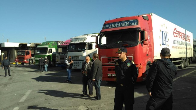 Ήδη από χθες το βράδυ 150 νταλίκες είχαν παραταχθεί στο λιμάνι του Ηρακλείου περιμένοντας το πλοίο ασφαλείας που θα τις μετέφεραν στον Πειραιά.