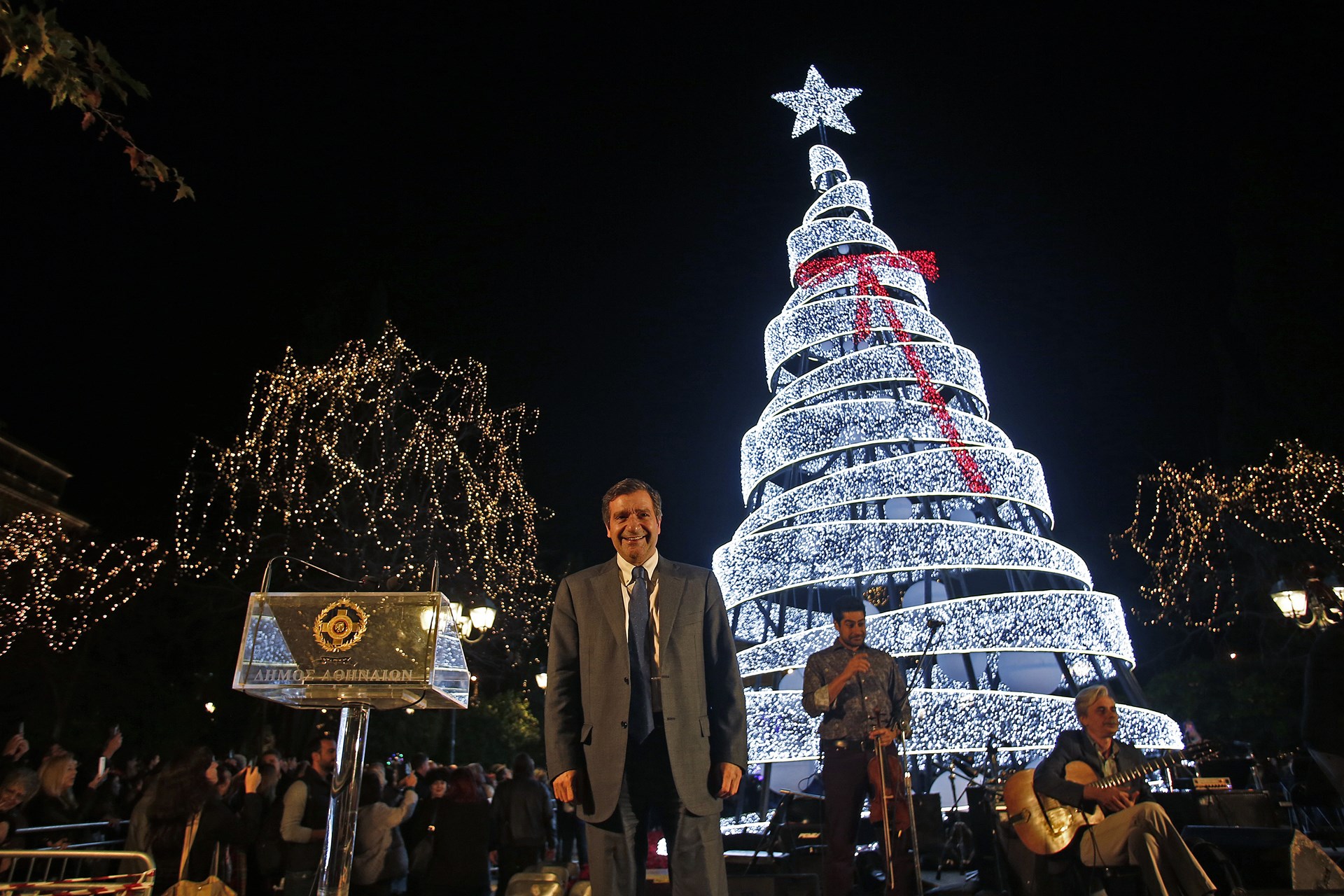 Ο δήμαρχος Αθηναίων, Γιώργος Καμίνης «άναψε» το χριστουγεννιάτικο δέντρο θέλοντας να στείλει «μήνυμα γιορτής κι αισιοδοξίας».