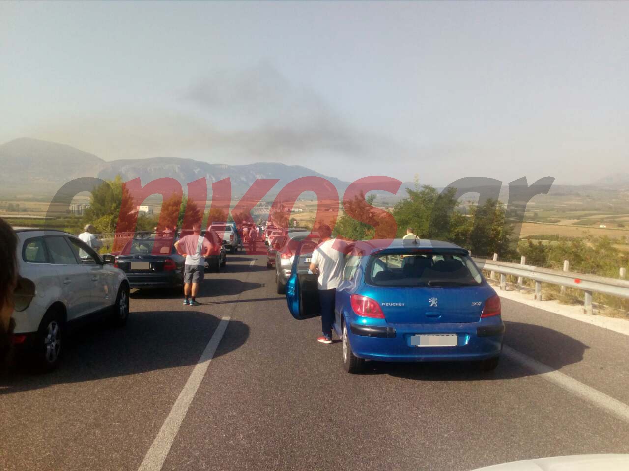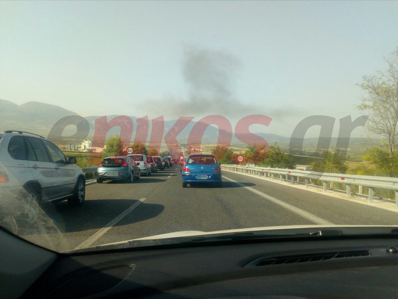 Όπως φαίνεται και στις φωτογραφίες που έστειλε αναγνώστης του enikos.gr, στο βάθος των εικόνων φαίνεται ο καπνός από τη φωτιά που εκδηλώθηκε στο όχημα και τα αυτοκίνητα είναι ακινητοποιημένα.