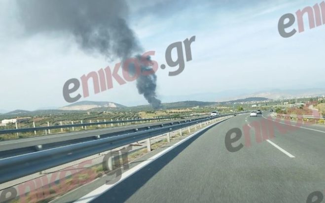 Το μέτωπο της φωτιάς από το εργοστάσιο είναι ορατό ακόμα και από την Εθνική οδό Αθηνών Λαμίας.