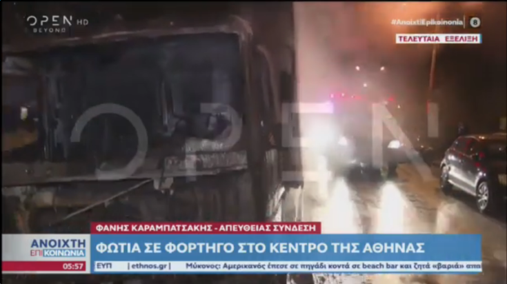 Φωτιά ξέσπασε τα ξημερώματα της Τετάρτης 16 Νοεμβρίου σε φορτηγό στο κέντρο της Αθήνας, στην οδό Μουστοξίδη, πίσω από τα Δικαστήρια της σχολής Ευελπίδων.