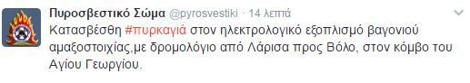 Φωτιά ξέσπασε νωρίτερα σε βαγόνι αμαξοστοιχίας, με δρομολόγιο από Λάρισα προς Βόλο, στον κόμβο του Αγίου Γεωργίου. Σύμφωνα με την πυροσβεστική το βαγόνι ακινητοποιήθηκε, οι επιβάτες αποβιβάστηκαν και στο σημείο έσπευσαν 8 πυροσβέστες με 3 οχήματα. Λίγο αργότερα η φωτιά κατασβέστηκε.