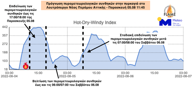 – Κατά το χρονικό διάστημα μεταξύ 5/8 (17:00/18:00) και 6/8 (06:00/07:00) αναμένεται μερική βελτίωση των πυρομετεωρολογικών συνθηκών κυρίως λόγω της εξασθένησης των ανέμων στα 3-4 μποφόρ από ΒΒΔ διευθύνσεις, ωστόσο η υγρασία της νεκρής δασικής καύσιμης ύλης θα διατηρηθεί σε σχετικά χαμηλά επίπεδα (κάτω του 15 %).