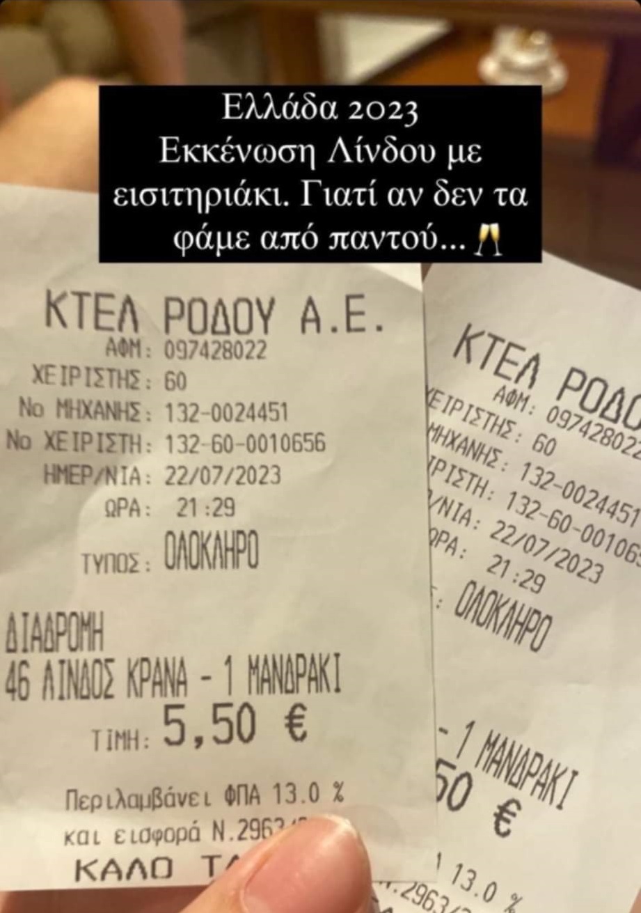 Χρήστες έχουν ανεβάσει μία φωτογραφία, η οποία δείχνει δύο εισιτήρια του ΚΤΕΛ Ρόδου για τη διαδρομή Λίνδο-Μανδράκι. «Ελλάδα 2023. Εκκένωση Λίνδου με εισιτηριάκι. Γιατί αν δεν τα φάμε από παντού» γράφει η λεζάντα της φωτογραφίας.