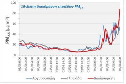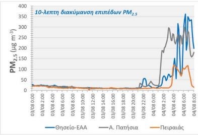 – Στον Κεντρικό τομέα παρατηρήθηκε πολύ μεγάλη αύξηση των επιπέδων (άνω των 250 μg m -3 ), από τις 2:00 τα ξημερώματα της 4 ης Αυγούστου, η οποία διαρκεί έως τώρα. Στον Πειραιά, παρατηρήθηκε επίσης επιβάρυνση μετά τις 4:00, αλλά τα επίπεδα παρέμειναν σχετικά χαμηλότερα.