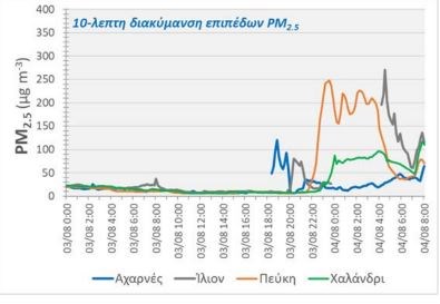 – Η πρώτη επιβάρυνση παρατηρήθηκε δυτικά του τομέα της πυρκαγιάς, στην περιοχή των Αχαρνών, μετά τις 18:00. Με τη μεταβολή του ανέμου άρχισε να παρατηρείται μεγάλη επιβάρυνση αρχικά στον Δυτικό (Ίλιον) και κατόπιν στον Βόρειο τομέα (Πεύκη) του Λεκανοπεδίου, η οποία διήρκεσε όλη τη νύχτα και μεγιστοποιήθηκε κατά το διάστημα 11:00- 3:00 (με 10-λεπτες συγκεντρώσεις που ξεπέρασαν τα 200 μg m -3 ). Στη συνέχεια παρατηρήθηκε σχετική υποχώρηση, ωστόσο έως τις 8:00 της 4 ης Αυγούστου παραμένουν υψηλά (άνω των 50 μg m -3 ).