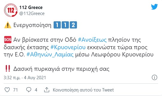 Το μήνυμα ανέφερε: «Αν βρίσκεστε στην Οδό #Ανοίξεως πλησίον της δασικής έκτασης #Κρυονερίου εκκενώστε τώρα προς την Ε.Ο. #Αθηνών -Λαμίας μέσω Λεωφόρου Κρυονερίου. Δασική πυρκαγιά στην περιοχή σας»
