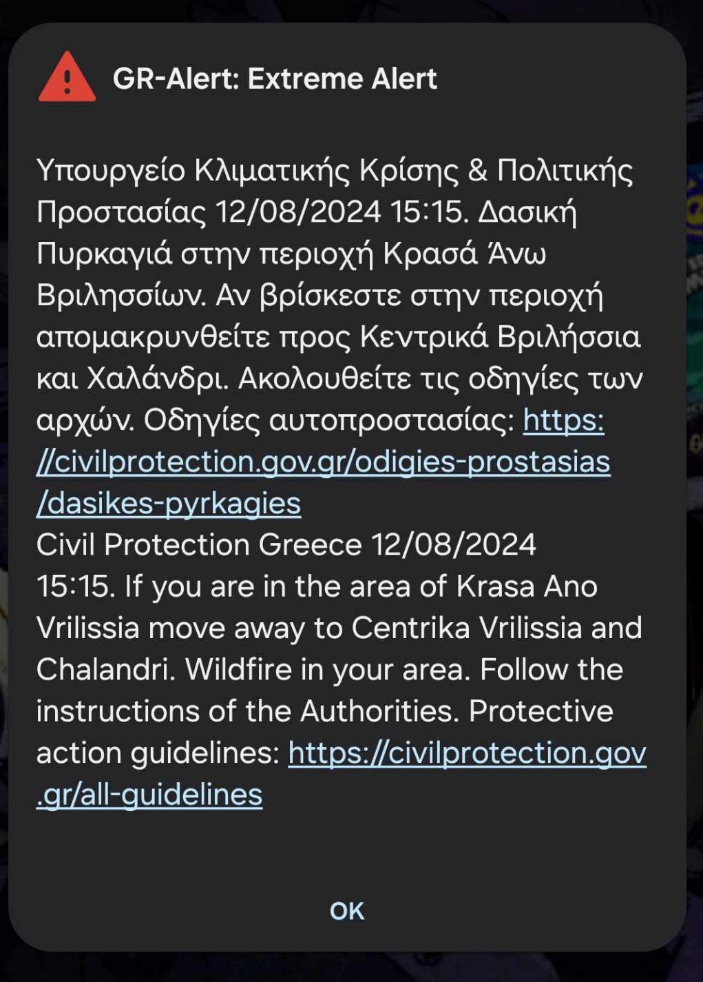 Συγκεκριμένα, με μήνυμα από το 112 οι κάτοικοι την περιοχής Κρασά Άνω Βριλησσίων κλήθηκαν σε απομάκρυνση προς Κεντρικά Βριλήσσια και Χαλάνδρι.