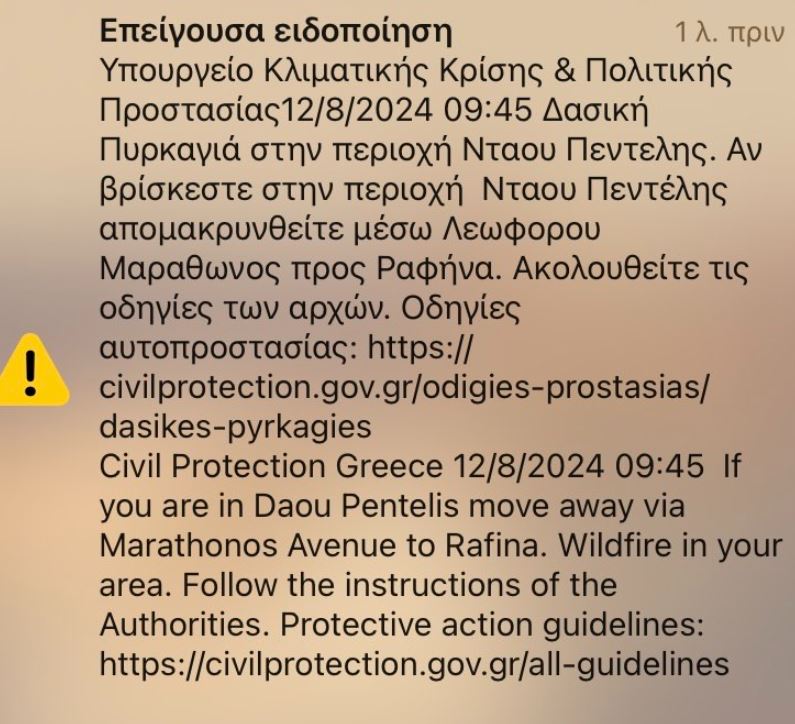 Συγκεκριμένα, στο μήνυμα του 112 αναφέρεται ότι, «αν βρίσκεστε στην περιοχή Νταού Πεντέλης, απομακρυνθείτε μέσω Λεωφόρου Μαραθώνος προς Ραφήνα».