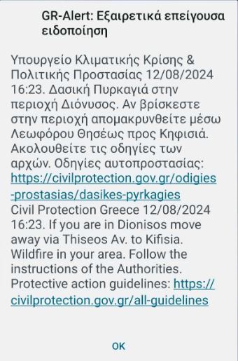 Νέο μήνυμα για εκκένωση από το 112 έλαβαν οι κάτοικοι της περιοχής Διόνυσος, λόγω της φωτιάς που μαίνεται στη Βορειοανατολική Αττική, από το μεσημέρι της Κυριακής (11/08).