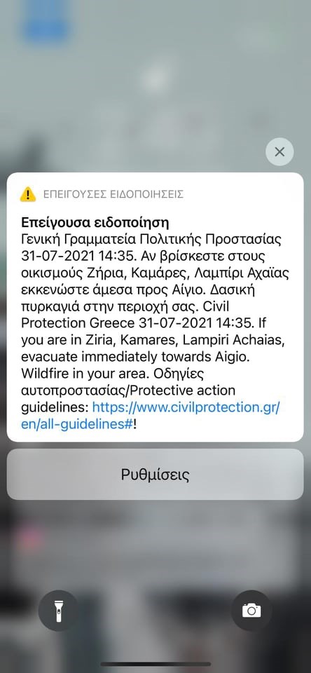 Μήνυμα μέσω του 112 έλαβαν οι κάτοικοι τριών οικισμών στην Αχαΐα, προκειμένου να απομακρυνθούν από αυτές τις περιοχές, λόγω της μεγάλης φωτιάς που βρίσκεται σε εξέλιξη. Συγκεκριμένα, εντολή εκκένωσης έλαβαν όσοι βρίσκονται στους οικισμούς Ζήρια, Καμάρες και Λαμπίρι Αχαΐας, ενώ τους δίνεται οδηγία να κινηθούν άμεσα προς το Αίγιο. Η κατάσταση που επικρατεί στην περιοχή, λόγω της φωτιάς είναι δύσκολη, καθώς οι φλόγες βρίσκονται κοντά στους οικισμούς. Οι άνεμοι έχουν ένταση 3 μποφόρ με ριπές που φτάνουν τα 6, σύμφωνα με την Πυροσβεστική. Επί τόπου βρίσκονται και επιχειρούν ισχυρές επίγειες και εναέριες δυνάμεις.