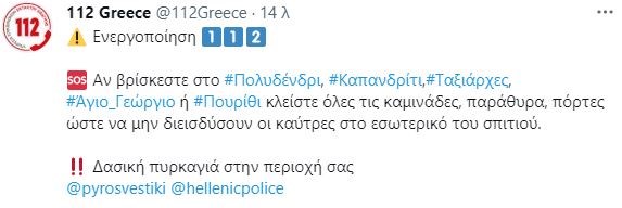 Σημειώνεται ότι μέσω του “112” εστάλη μήνυμα στους κατοίκους των περιοχών Πολυδένδρι, Καπανδρίτι, Ταξιάρχες, Άγιος Γεώργιος ή Πουρίθι να κλείσουν όλες τις καμινάδες, τα παράθυρα και τις πόρτες ώστε να μην διεισδύσουν οι καύτρες στο εσωτερικό του σπιτιού.