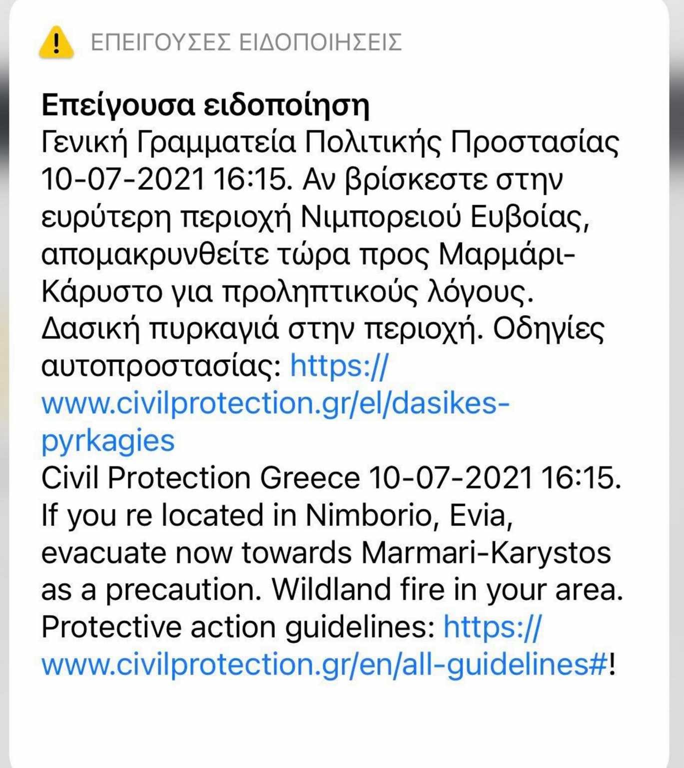 Το 112 της Γενικής Γραμματείας Πολιτικής Προστασίας έστειλε μήνυμα στο οποίο καλεί όσους πολίτες βρίσκονται στην ευρύτερη περιοχή του Νιμπορειού Ευβοίας, να απομακρυνθούν άμεσα προς Μαρμάρι-Κάρυστο για προληπτικούς λόγους, καθώς βρίσκεται σε εξέλιξη η μεγάλη φωτιά στα Στύρα.