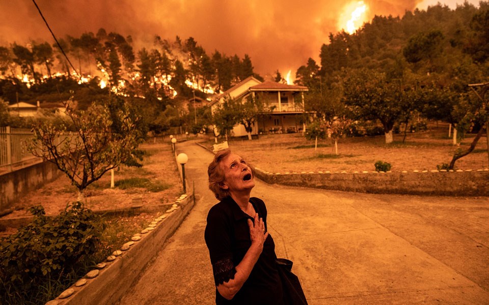 Οι τρομακτικές φλόγες της φωτιάς στην Εύβοια που περικύκλωσαν χωριά οδήγησαν πολλούς κατοίκους να ξεσπιτωθούν και να απομακρυνθούν προκειμένου να αναζητήσουν ασφαλές καταφύγιο. Η απόγνωση, ο φόβος και η απελπισία αποτυπώνονται με τον πιο ξεκάθαρο τρόπο στις φωτογραφίες που κάνουν τον γύρο του διαδικτύου και έχουν γίνει viral, όπου μια ηλικιωμένη φεύγει αναγκαστικά από το σπίτι της στις Γούβες και μοιάζει σαν να μην πιστεύει αυτό που συμβαίνει. Σαν να υψώνει κραυγή αγωνίας. Με το χέρι της στο στήθος της στη μία φωτογραφία κλείνει τα μάτια της, σαν να θέλει να ξορκίσει το κακό πίσω της και στην άλλη υψώνει το βλέμμα της στον ουρανό, βλέποντας το αποκαρδιωτικό θέαμα των πυκνών καπνών και είναι σαν να ζητεί βοήθεια από τον Θεό για να σωθεί ο τόπος της και οι άνθρωποι. Πίσω της η πυρκαγιά “καταπίνει” το δάσος και έχει φτάσει μια… ανάσα από τα σπίτια.
