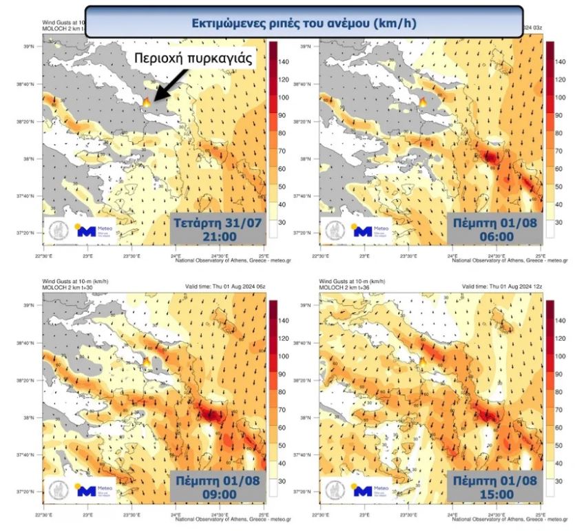 Σταδιακή ενίσχυση των ανέμων αναμένεται εκ νέου από τις πρωινές ώρες της Πέμπτης 01/08. Στον παρακάτω χάρτη παρουσιάζονται οι ριπές του άνεμου κατά τις βραδινές ώρες της Τετάρτης 31/07 και τις πρώτες πρωινές ώρες της Πέμπτης 01/08 όπου δεν αναμένεται να ξεπεράσουν τα 30 χλμ/ώρα (Εικόνα 1), ενώ σταδιακά από τις πρωινές ώρες έως τις μεσημβρινές ώρες της Πέμπτης 01/08 οι ριπές του ανέμου αναμένεται να ξεπεράσουν τα 40-50 χλμ/ώρα.