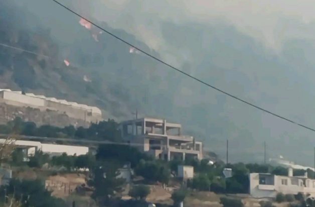 Στην περιοχή πνέουν ισχυροί βόρειοι άνεμοι έντασης 6 μποφόρ, οι οποίοι δυσχεραίνουν το έργο των Πυροσβεστών.