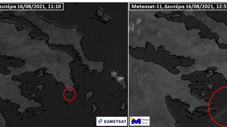 Ο καπνός έγινε για πρώτη φορά ορατός από τον δορυφόρο από λίγο μετά τις 11:00, οπότε και έφτασε πάνω από τη θάλασσα (αριστερά). Παρασυρόμενος από τους ισχυρούς βόρειους ανέμους έφτασε λίγο πριν τις 13:00 στο ύψος των Σπετσών (δεξιά).