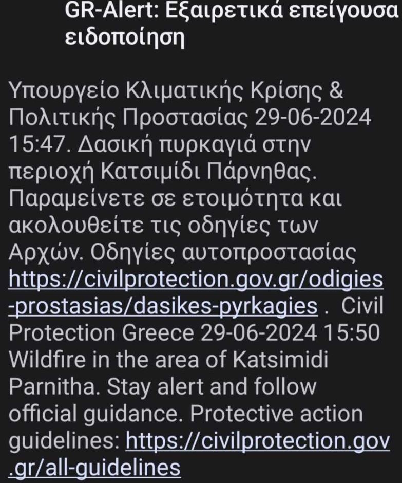 Στο μήνυμα αναφέρεται ότι βρίσκεται σε εξέλιξη δασική πυρκαγιά στην περιοχή Κατσιμίδι και καλούνται οι πολίτες να παραμείνουν σε ετοιμότητα και να ακολουθούν τις οδηγίες των αρχών.