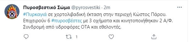 Συναγερμός έχει σημάνει στην Πυροσβεστική για φωτιά που ξέσπασε στην Πάρο. Η φωτιά καίει χορτολιβαδική έκταση στην περιοχή Κώστος, στη νοτιοανατολική πλευρά του νησιού.