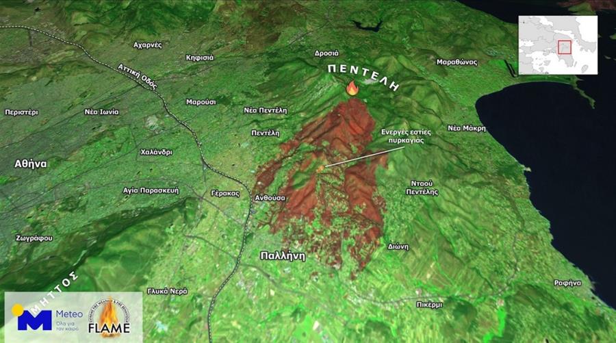 Συγκεκριμένα, με βάση την εικόνα πολύ υψηλής ανάλυσης που ελήφθη από το δορυφόρο Landsat 9 την Τετάρτη (20/7) στις 12:05 τοπική ώρα (Εικόνα 1), την οποία ανέκτησε και επεξεργάστηκε στις 21:00 το ίδιο βράδυ η πυρομετεωρολογική ομάδα FLAME του Εθνικού Αστεροσκοπείου Αθηνών (ΕΑΑ)/meteo.gr, η νεότερη εκτίμηση για την έκταση που επηρέασε η δασική πυρκαγιά της Πεντέλης, είναι περίπου 20.350 στρέμματα.