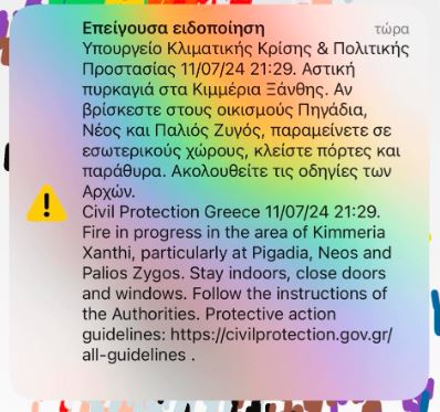 Μήνυμα από το 112 έλαβαν πριν από λίγο οι κάτοικοι των οικισμών Πηγάδια, Νέος και Παλιός Ζύγος, στην Ξάνθη, έπειτα από την φωτιά που ξέσπασε το απόγευμα της Πέμπτης (11/07), κοντά στην περιοχή Κιμμέρια.