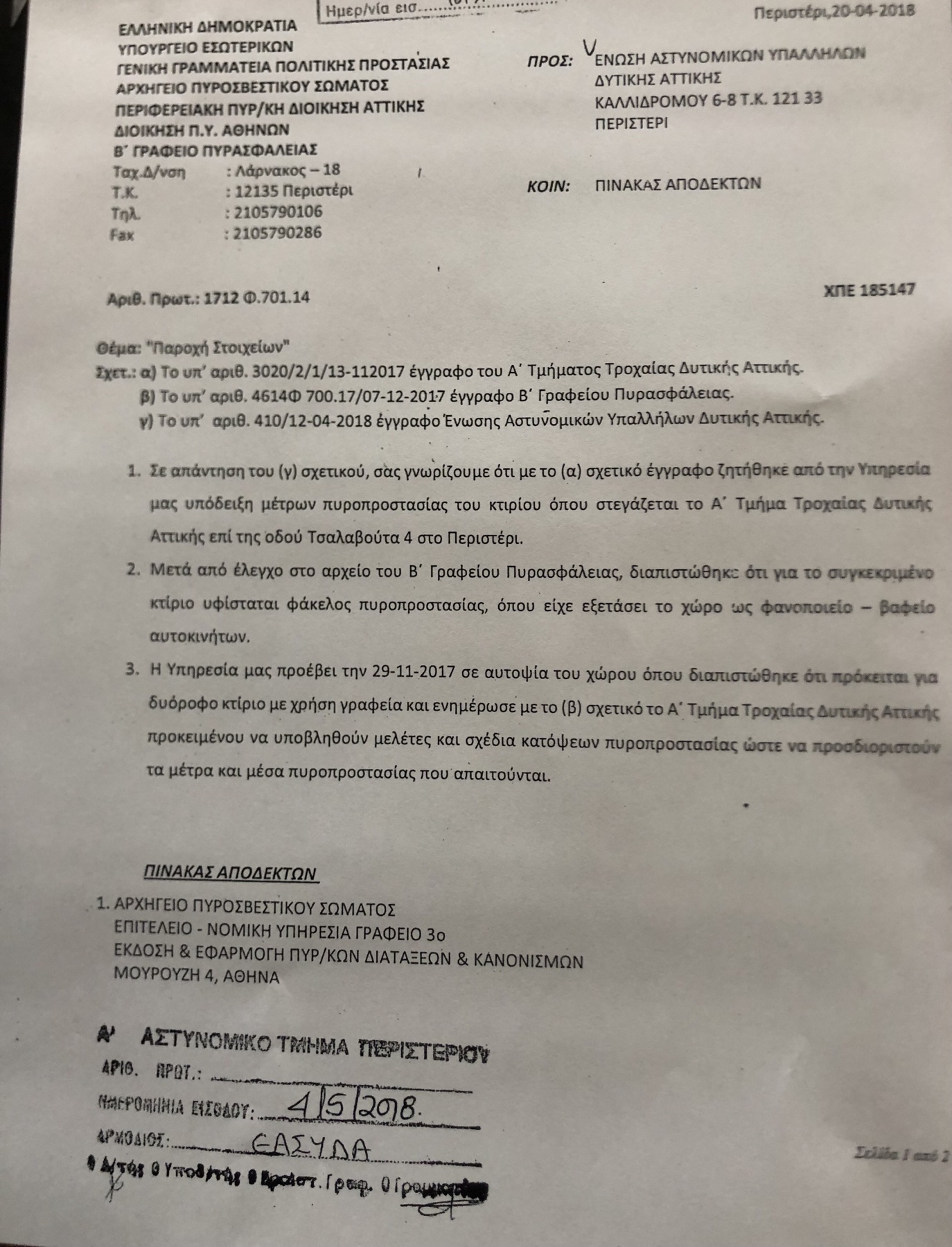 Ειδικότερα, το εν λόγω κτήριο είναι παράνομο, δηλαδή δεν διαθέτει οικοδομική άδεια, είναι κτισμένο προ του έτους 1955 και εξαιρείται της κατεδάφισης, βάση μίας χαριστικής διάταξης (άρθρο 88 του Ν.4495/2017). Εν συνεχεία, σύμφωνα με το Β΄ γραφείο πυρασφάλειας της Πυροσβεστικής Υπηρεσίας Αθηνών, υφίσταται φάκελος πυροπροστασίας που είχε εξετάσει τον χώρο ως φανοποιείο – βαφείο αυτοκίνητων. Επίσης με σχετικό έγγραφο προς το Α΄ Τ.Τ. Δυτικής Αττικής η Πυροσβεστική Υπηρεσία, ζητούσε να υποβληθούν μελέτες και σχέδια κατόψεων πυροπροστασίας ώστε να προσδιοριστούν τα μέσα και τα μέτρα πυροπροστασίας που απαιτούνται.