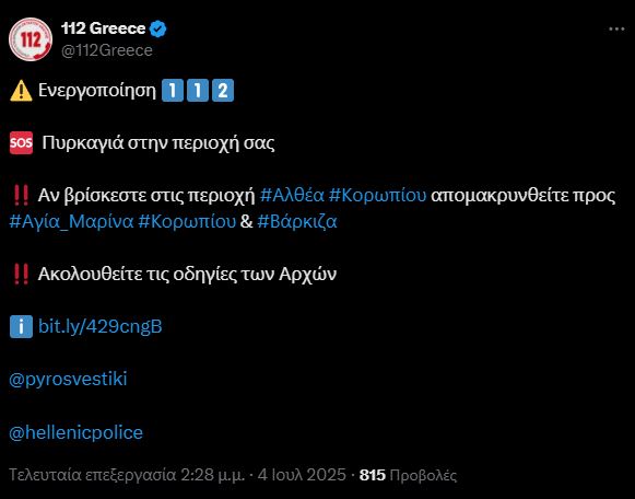 Νέο μήνυμα εστάλη πριν από λίγο μέσω του 112 για την φωτιά που εκδηλώθηκε το μεσημέρι της Παρασκευής (4/7) σε περιοχή με χαμηλή βλάστηση, στον Άγιο Δημήτριο, στο Κορωπί. Υπενθυμίζεται ότι η φωτιά καίει σε οικοπεδικούς χώρους, ενώ κοντά βρίσκονται κατοικίες.