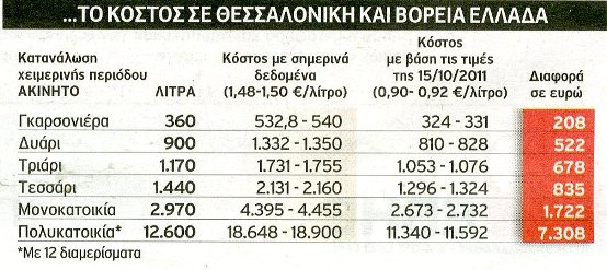 Στο 1.48 με 1,50 ευρώ το λίτρο, αναμένεται να κυμανθεί η τιμή του πετρελαίου θέρμανσης, που θα ξεκινήσει σε λίγες ημέρες, όταν πέρυσι είχε ξεκινήσει με εύρος τιμών από 0,90 με 0,92 ευρώ το λίτρο. Η φετινή επιβάρυνση αποδίδεται στην αύξηση του Ειδικού Φόρου Κατανάλωσης του πετρελαίου θέρμανσης στο 80% του πετρελαίου κίνησης. Δηλαδή ο ΕΦΚ, από τα 60 ευρώ ανά χίλια λίτρα, να ανέβει στα 330 ευρώ και όχι στα 412 ευρώ.Σύμφωνα με έρευνα της εφημερίδας Έθνος της Κυριακής, το κόστος θέρμανσης στην Αττική και σε νότιες περιοχές της χώρας, στη διάρκεια της χειμερινής περιόδου, θα είναι σε σχέση με πέρυσι υψηλότερο από 116 ευρώ για μία οικογένεια που μένει σε γκαρσονιέρα, μέχρι και 4.060 ευρώ για τους ενοίκους μιας πολυκατοικίας στην Αθήνα. Η αντίστοιχη επιβάρυνση για τις περιοχές της Θεσσαλονίκης και της Βόρειας Ελλάδας θα είναι από 208 ευρώ μέχρι 7.308 ευρώ.Πιο συγκεκριμένα και ανά τύπο κατοικίας, ένα νοικοκυριό στην Αττική που διαμένει σε τριάρι, για κατανάλωση πετρελαίου, τον χειμώνα, 650 λίτρων θα πληρώσει από 962 ευρώ μέχρι 975 ευρώ, δηλαδή 377 ευρώ περισσότερα από την αντίστοιχη περυσινή περίοδο. Για την Θεσσαλονίκη, το κόστος θέρμανσης για 1.170 λίτρα είναι από 1.731 ευρώ μέχρι 1.755 ευρώ.